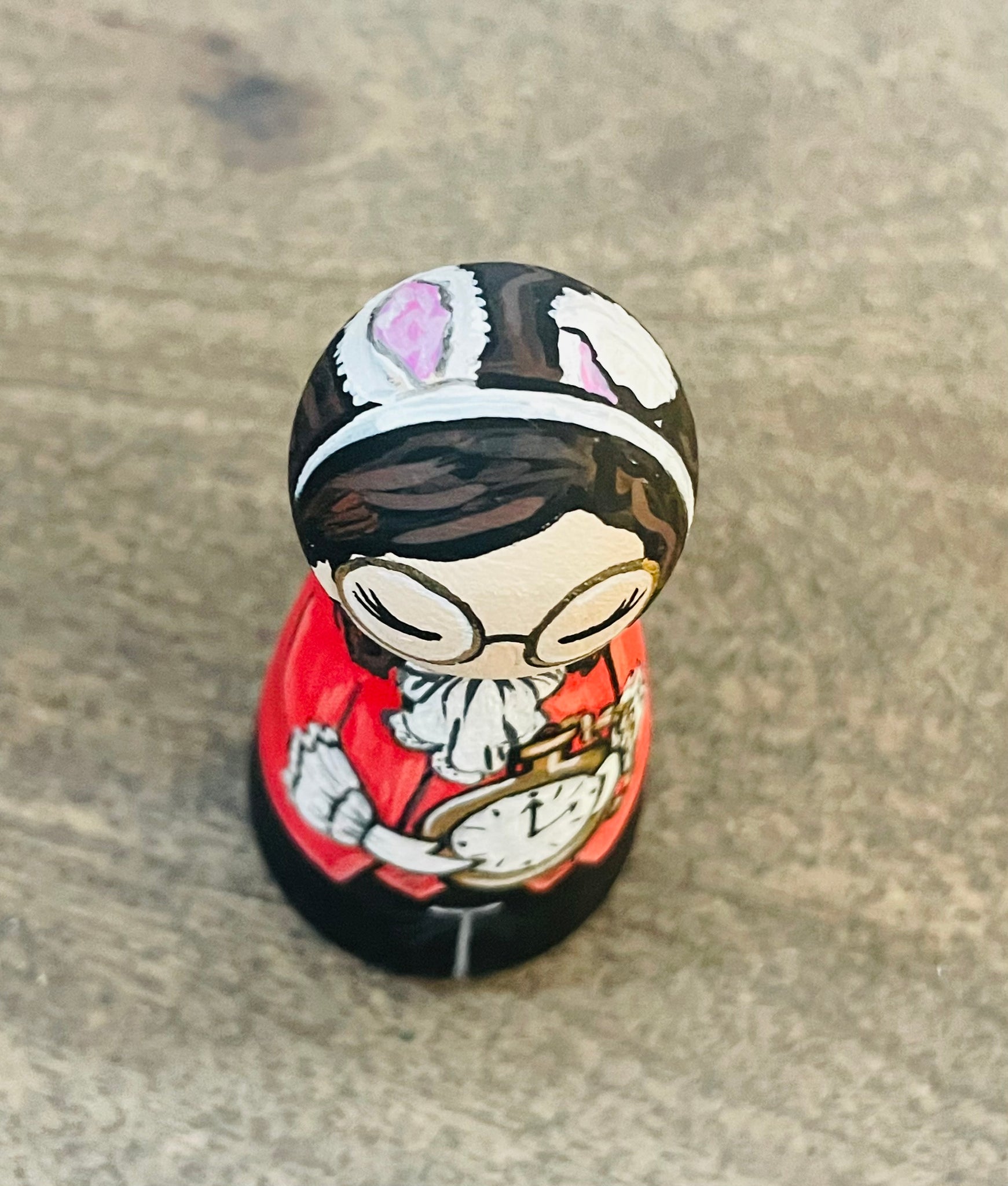 The dolls pictured are examples — each doll is painted to order and fully customized to reflect your unique details! You have the option to add a mini playbill or prop item painted on the side of the doll.